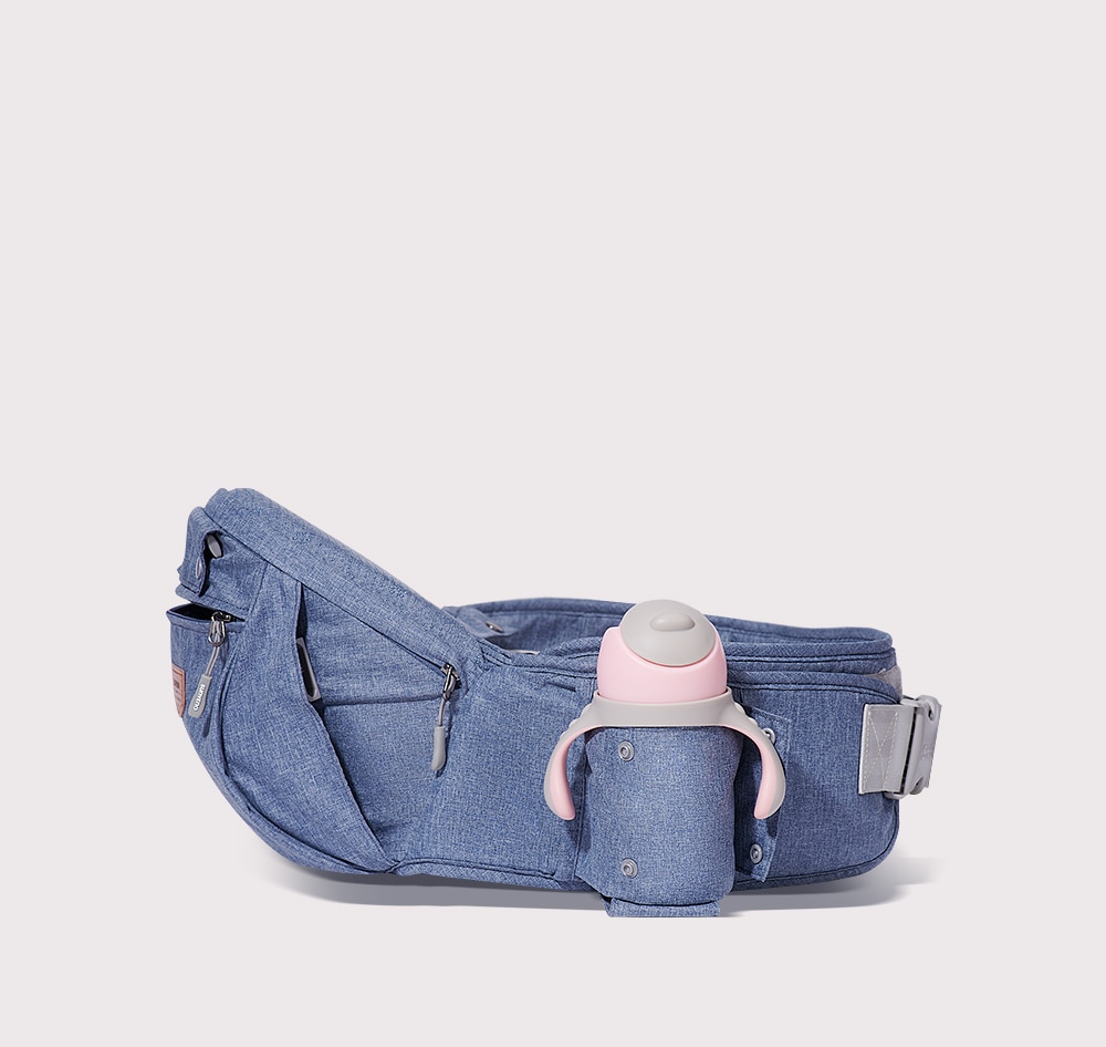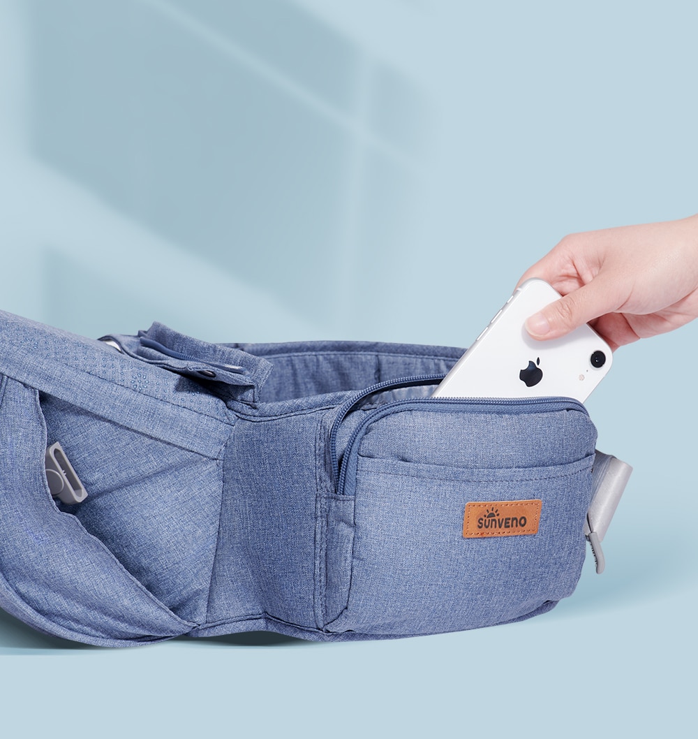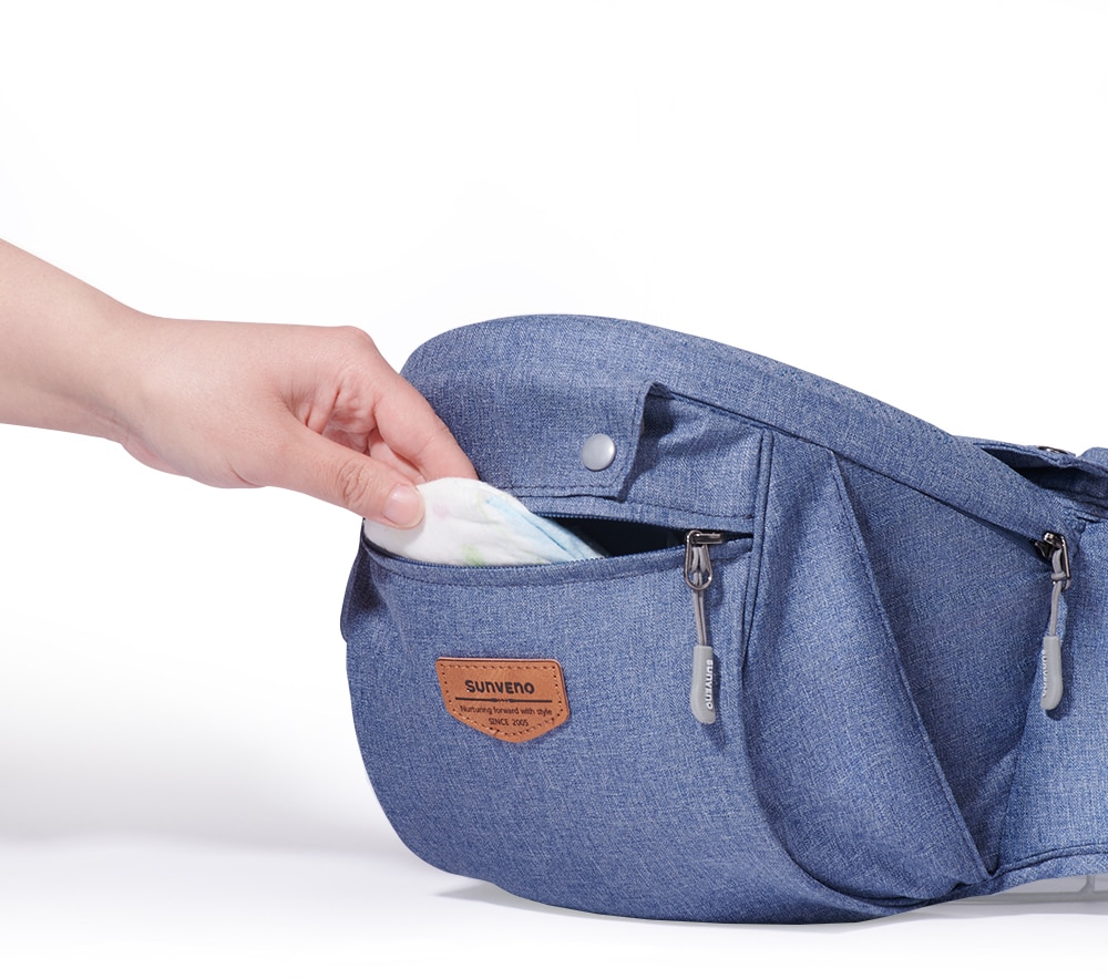 L’assise est équipée d’une grande poche et de poches latérales zippées pour transporter le nécessaire pour bébé. Une poche avant sur le côté dorsale de bébé, un porte biberon sur le côté. Pas besoin de sac supplémentaire, vous pourrez tout y ranger.