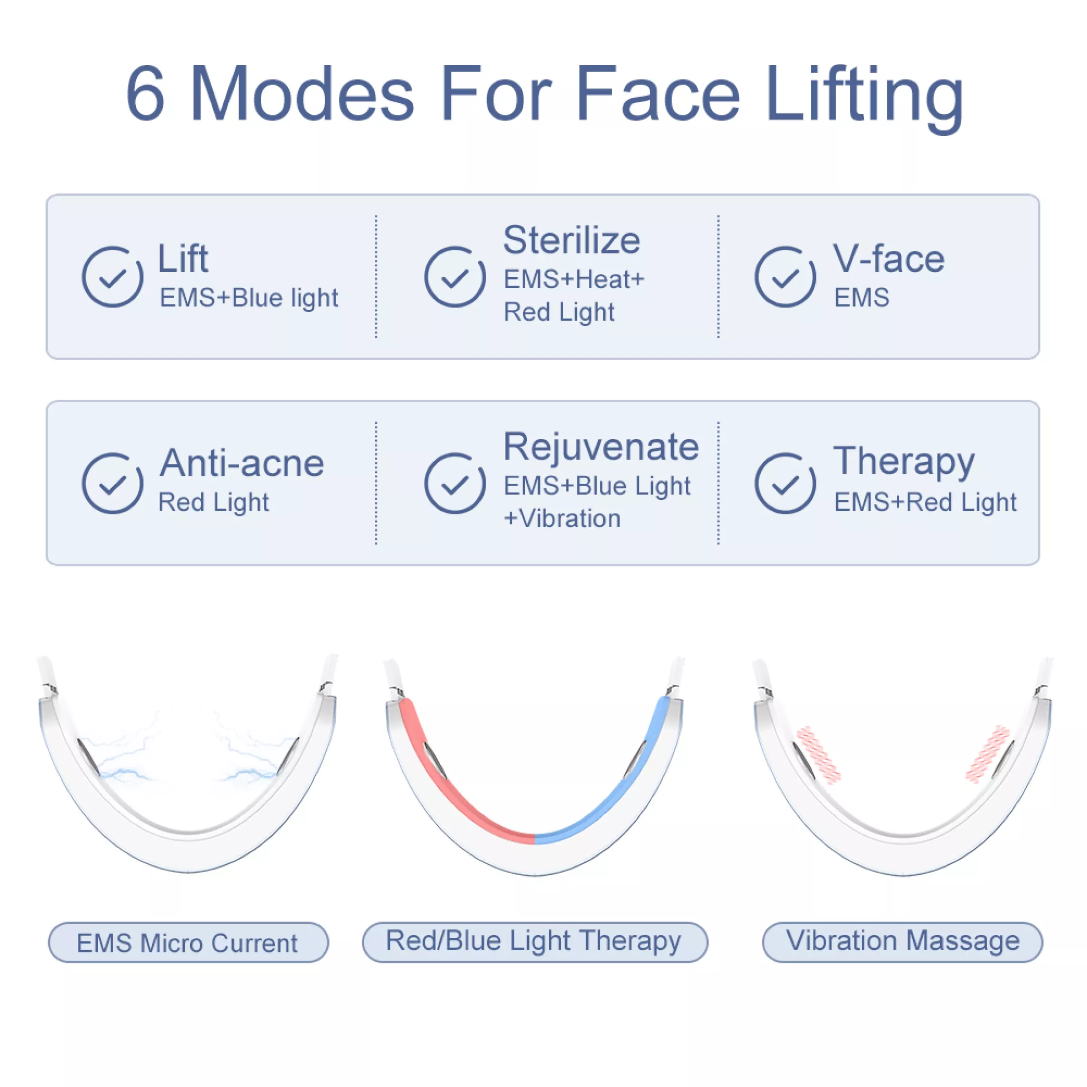 Vous aurez le choix parmi 6 modes. Vous pourrez choisir celui que vous souhaitez en fonction de votre envie comme par exemple le mode lift ou bien encore le mode anti-acné.